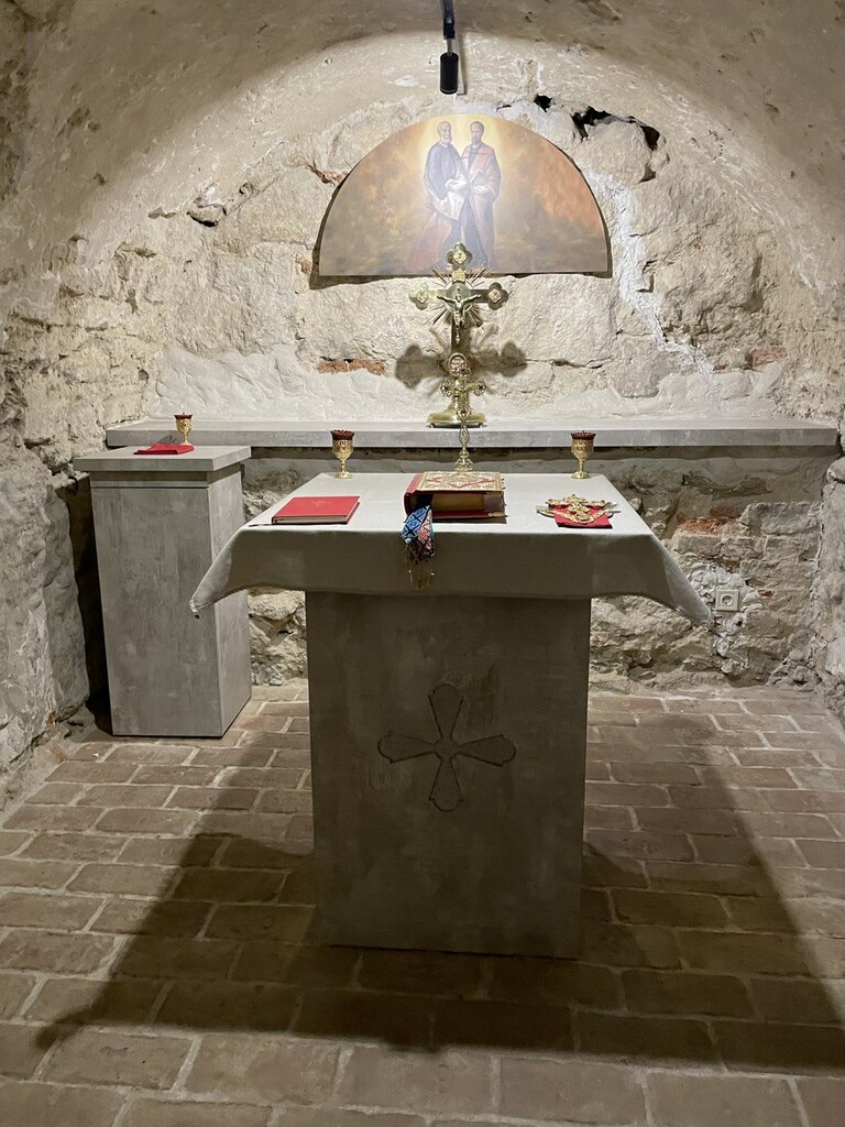 Під Гарнізонним храмом св. апостолів Петра і Павла, що у центрі Львова, розташоване підземелля. Воно двоярусне, оздоблене фресками та зберігає саркофаг львівського архієпископа і мощі 12 апостолів. Саме там ми побували на екскурсії.