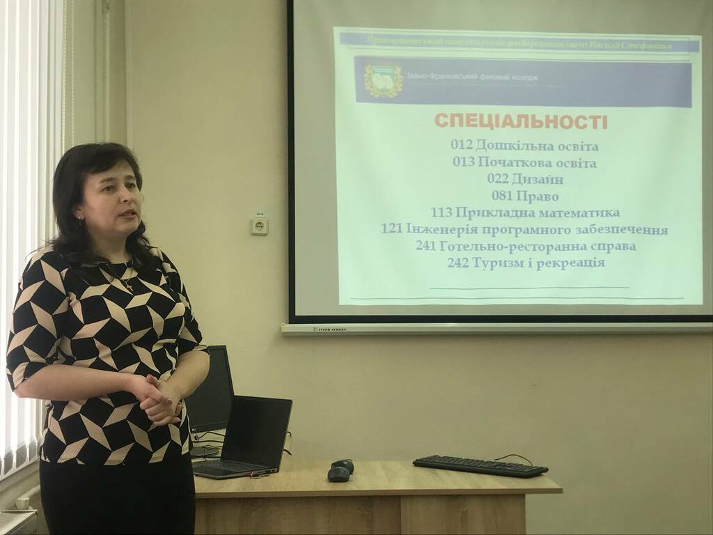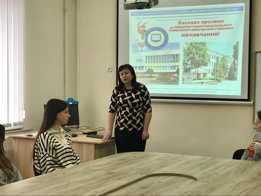 15 березня 2024 року викладачка навчальної дисципліни «Методика трудового навчання з практикумом», професорка Оксана Цюняк мала нагоду поспілкуватися з учнями 8-9 класів Княгиницького ліцею Рогатинської міської ради. Школярі з цікавістю слухали інформацію про Прикарпатський національний університет імені Василя Стефаника, який є не лише лідером серед закладів вищої освіти в регіоні, а й центром наукової думки. Присутні дізналися про особливості організації освітнього процесу у Івано-Франківському фаховому коледжі Прикарпатського національного університету імені Василя Стефаника тощо. Оксана Петрівна презентувала фотоматеріали результатів навчально-виховної діяльності студентів коледжу, їхньої волонтерської роботи, студентського дозвілля тощо. Сподіваємося, що отримана інформація допоможе юнацтву у виборі майбутньої професії.