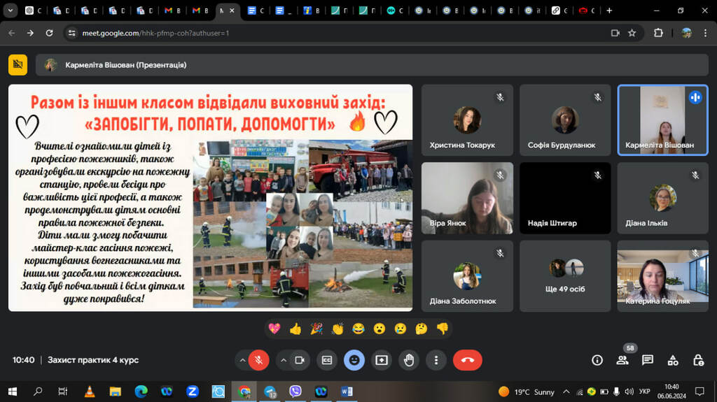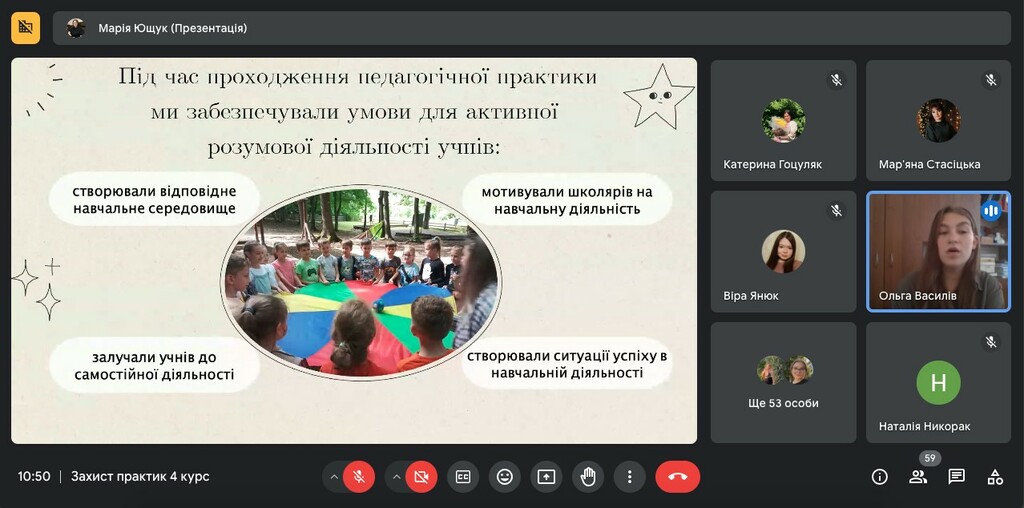 Педагогічна практика – це ключовий етап у підготовці майбутнього педагога, який дає змогу поєднати теорію з практикою. Важливою є остання практика, адже саме під час неї студенти застосовують знання та навички, проводячи уроки, беручи участь у заходах та спілкуючись з батьками. Студенти успішно пройшли практику, продемонструвавши високий рівень знань та професійних навичок.