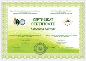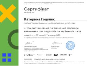 Міжнародний Сертифікат, №16089 від 30.09.2023. 180 акад. год (6,0 кредитів ECTS), з них 15 годин інклюзивної освіти/0,5 кредиту ECTS.